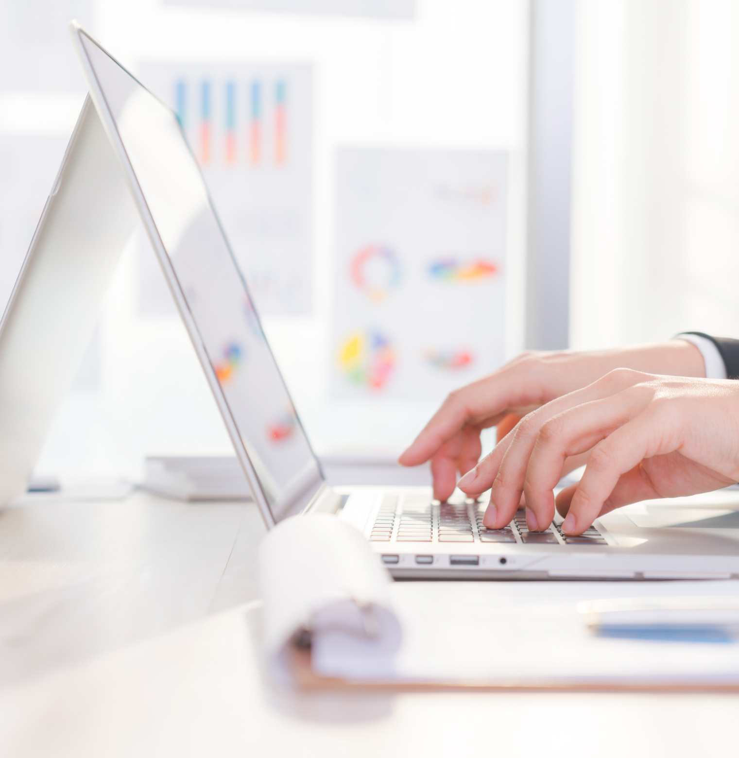 Person typing on a laptop with blurred business charts and graphs in the background0Person typing on a laptop with blurred business charts and graphs in the background1Person typing on a laptop with blurred business charts and graphs in the background2
