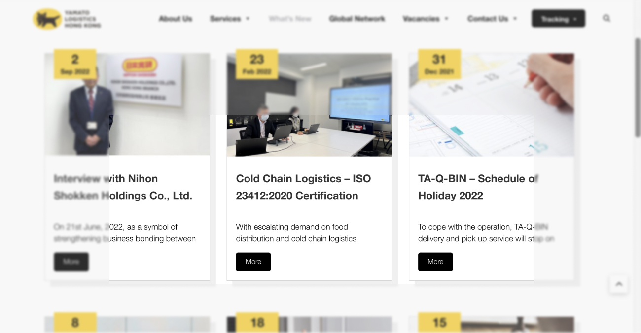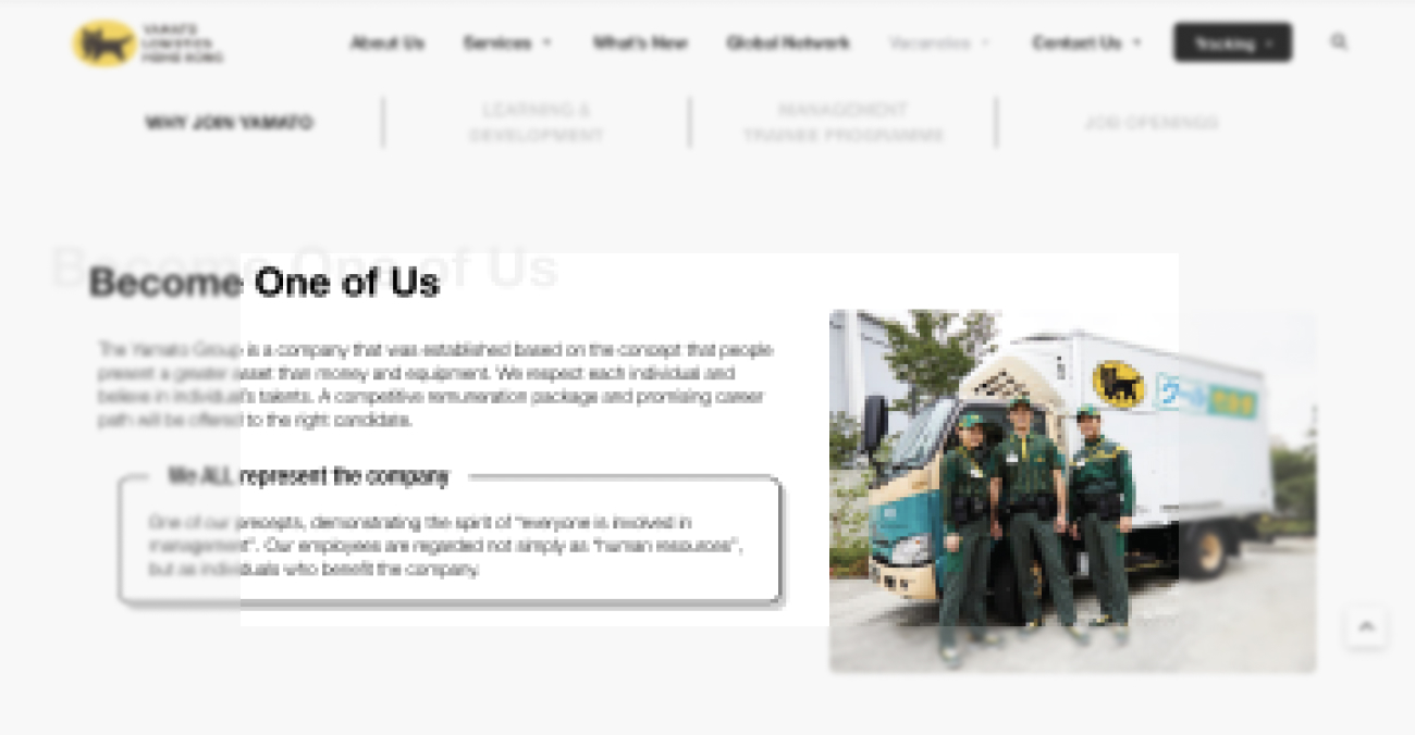 Yamato Logistics (HK) Ltd 是該地區領先的電子商務、電子零件和冷鏈業務的物流解決方案提供商。他們的主要業務包括國際貨運代理、門到門送貨服務、物流服務和本地/國際搬家服務。由於他們的網站過時,Yamato 發現很難在他們的網站上進行修改和改正。他們尋求 Visible One 的幫助來改造他們的網站,以解決這些問題。